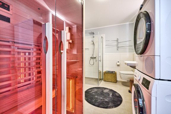 Aber nicht nur in der Ferienwohnung können Sie wundervolle Stunden verbringen. An warmen Sommertagen bietet der Balkon mit Gartenmöbeln einen herrlichen Platz zum Entspannen. Hier können Sie gemütlich frühstücken. Ein Highlight der Ferienwohnung ist die hochwertige Infrarotsauna, in der es sich auch an frostigen Wintertagen entspannen lässt.